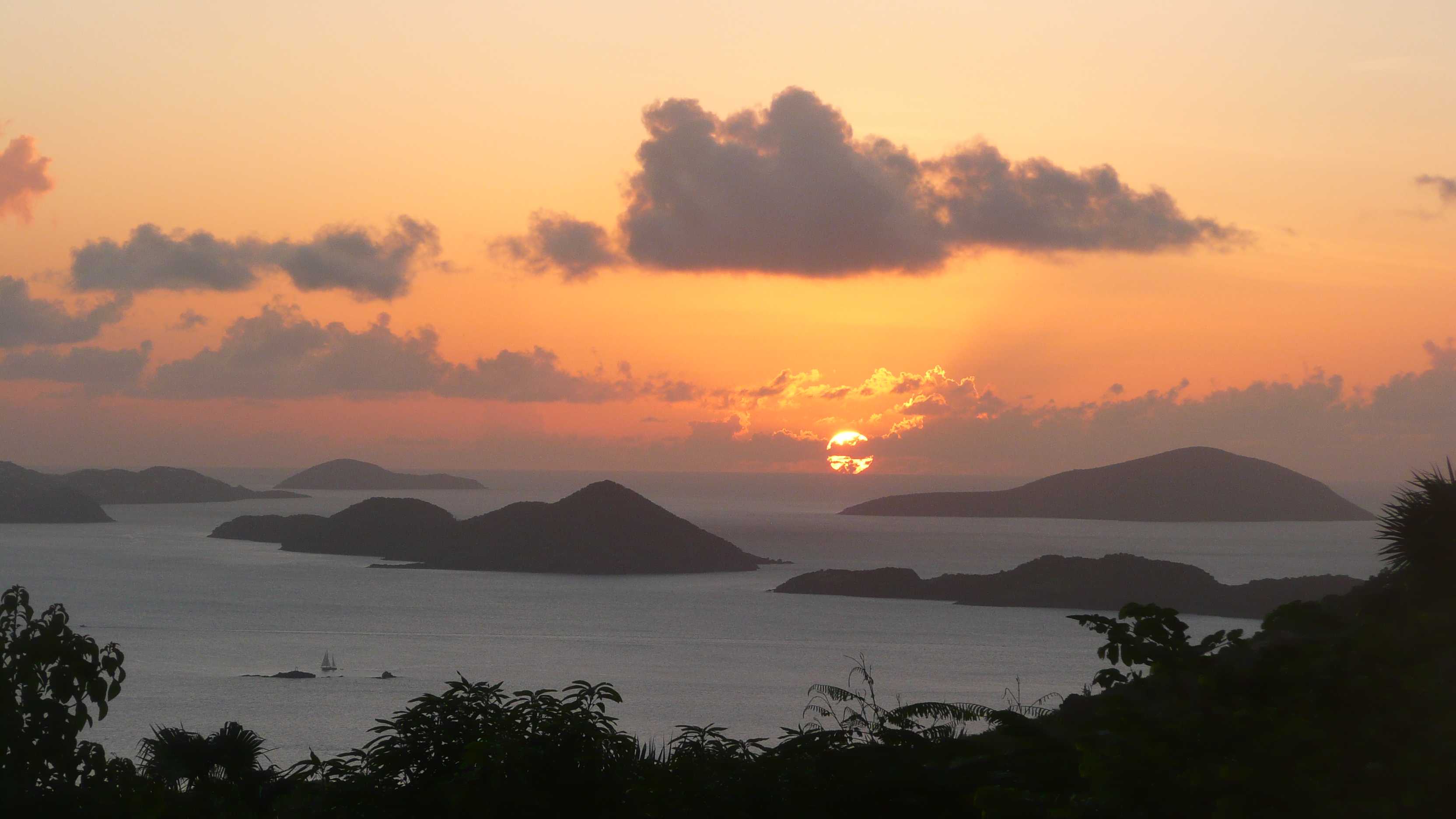Jenn: Your Christmas arrival is just a few days after the winter solstice, when the sun sets a bit south of Vieques. At the summer solstice, it sets just past the tip of Great Hans Lollik. I'll embed a couple of photos showing the dramatic difference between the two solstices, and a zoom from mid-January, in which Vieques is more clearly visible. That's Puerto Rico to the right and behind Vieques - 60 miles away!