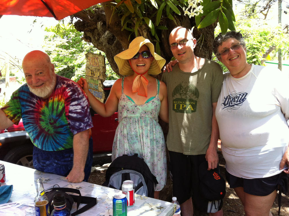 We all woke up feeling GREAT! Finally, on our last day, we seem to have this vacation thing all figured out. After another great mango pancake breakfast we decide to go back to Maho one more time so everybody can swim with the turtles. We find them easily this time. Since Amber and I got kind of turtled out yesterday we soon head off to the right and start taking turns with the iPhone camera. Amber uses her new diving skills to get a great picture of a parrot fish chowing down on coral. Then comes the big test. All her life she's been afraid of sharks (kind of an odd phobia for a Minnesotan, but I suppose we have Steven Spielberg to thank for that). Then we spot a big nurse shark (at least 4' long) resting on the bottom. She gingerly snaps a picture. Then the shark takes off. She looks at the shark, looks down at the camera, back at the shark - then takes off after it, snapping away! Amazing true-life example of how the paparazzi instinct banishes fear. Instead of succumbing to villa gravity, we decide to do a driving tour of the East End. Now that the kids have realized the potential of the DIY island vacation, they want to explore! We stop at Vie's for lunch, musing on the cycle of life as the non-vegetetarians among us munch on garlic chicken while tossing rice to the hens and chicks browsing around our feet. Miss Vie herself happens by and is kind enough to take our picture. But we're not done yet! Amber wants to see squid and Olin wants to see the desert part of the island, so we head down to Kiddel Bay. Amazingly, there are other cars there!! Have all my secret beaches been discovered? We note that there now seems to be a beehive in the big tree with the tire swing, and prudently park on the other side. We have a nice snorkel, but don't see squid. I think my favorite sight was a baby angel fish grooming a bar jack. (I realize that I've gotten past the point where I expect to see new flora/fauna each time and have started focusing on behaviors). I'm finally feeling comfortable with these fins (now that it's time to go home *sob*).