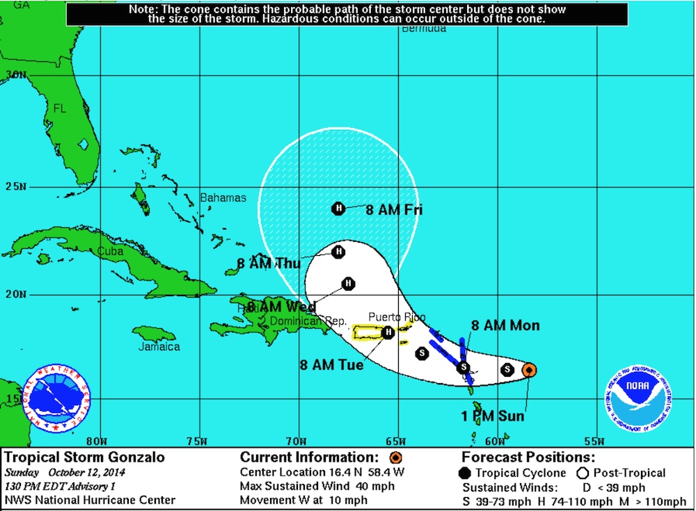 11 AM update: The storm track of Tropical Storm (soon to be Hurricane) Gonzalo is now forecast to pass just NE of Anegada, which is good news for St. John. Being away from the eye, and on the SW side, the wind speeds will be reduced. I plotted the 0, 12, 24, 36, and 48 hour forecast positions of the storm center from the 11 AM update on the graphic below. Looks as though this storm will produce more hurricane parties than damage.