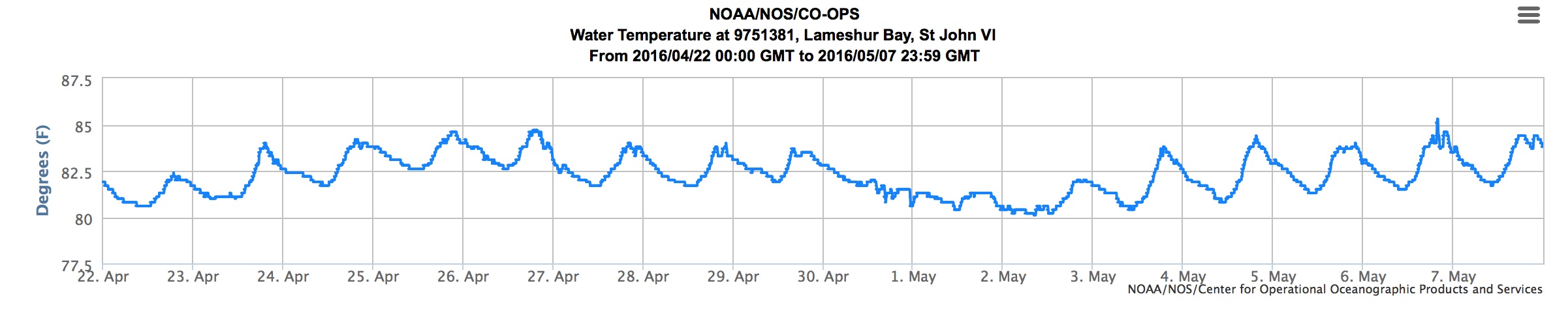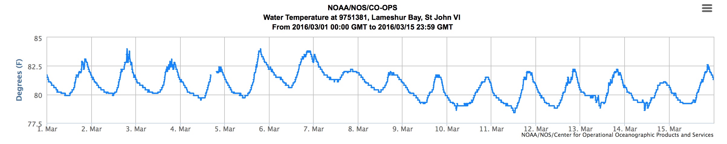 Sue: Comments and memories are fine, but data is even better! Here are two graphs from earlier in 2016, taken at Lameshur Bay; the first one is from March 1st to the 15th; the second is from April 22nd to May 7th. In general, ocean temperatures on St. John follow both a slow, year-long sine wave, as well as a far faster daily one, peaking in mid-afternoon. Of course, variations in cloud cover impose their own, less predictable variations. The warmest time of year for ocean temperature is August-September, at ~87 F in mid-afternoon, and the coolest is in January, at ~ 79 - 80F (Brrr!!!).