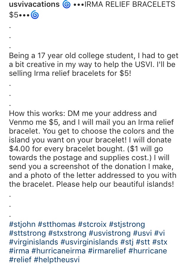 Hey! So I thought of this creative idea to raise money for the St. John gofundme page. Details are below. You can DM me on my USVI instagram page (the @ is @usvivacations) or DM me here on the forum to buy an Irma Relief bracelet.