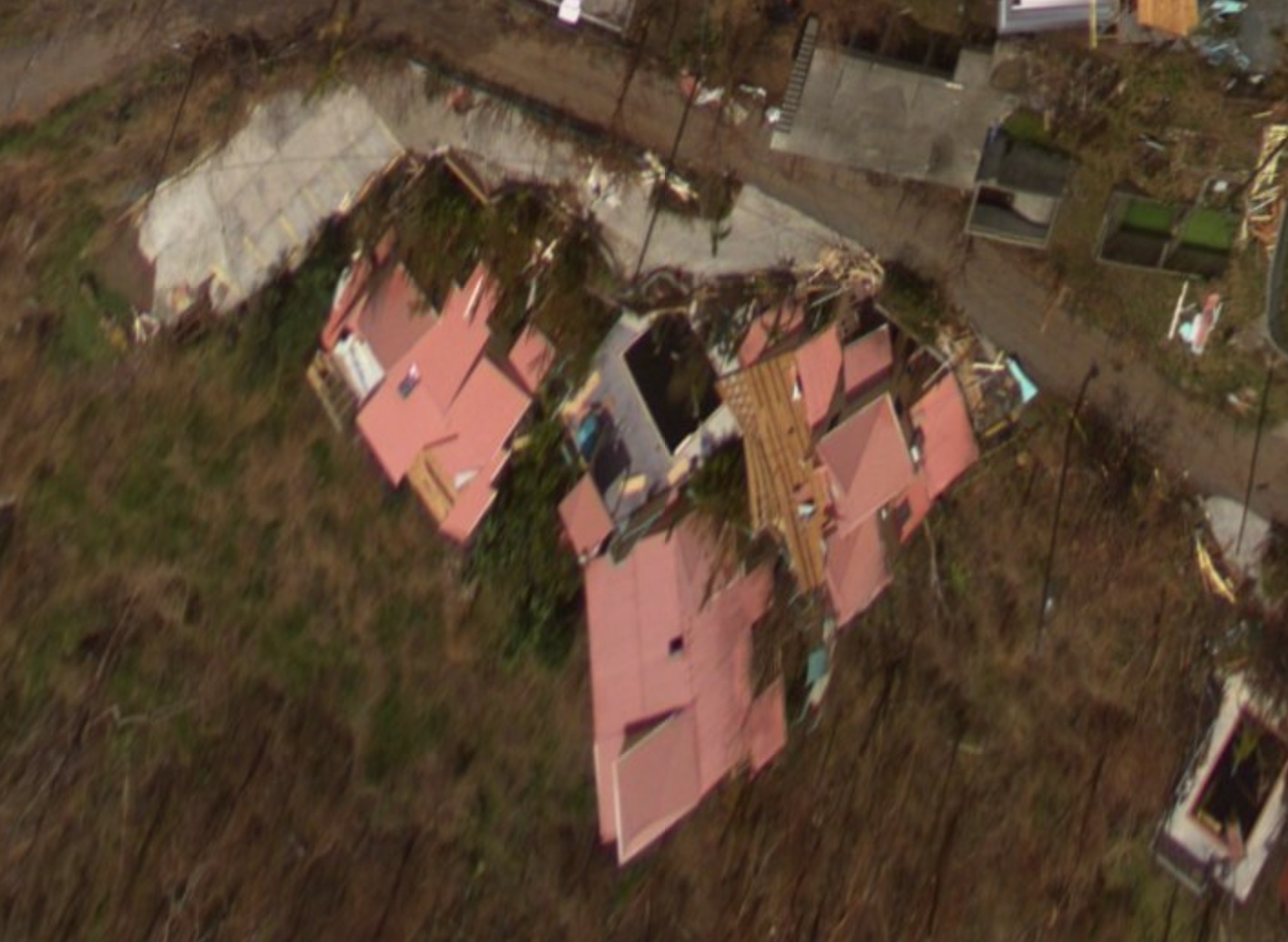 It looks as though Cruz Views definitely sustained some damage, as per the aerial photo below. We have stayed there on a number of occasions. There were always a number of light duty overhangs and such that could have been expected to suffer damage. The main structures were built by the same team (and around the same time) as Coconuts and Plumeria, as well as Gallows Point. Tom, the construction foreman, visited us a few years ago, and proudly pointed out his interior roof retention details, claiming "I've never lost a roof on this island"! That was certainly true through Hugo and Marilyn. Well, all of our roofs held firm during both those and Irma, as did Gallows Point, and most if not all of Cruz Views, but I do know of one roof he built for which Irma finally disproved his claim. Good solid work for sure, though, and much appreciated.