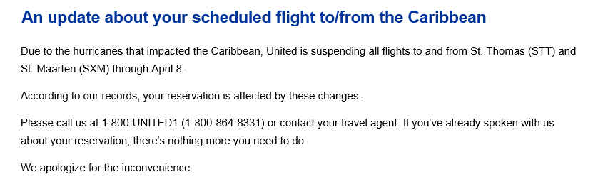 Due to the hurricanes that impacted the Caribbean, United is suspending all flights to and from St. Thomas (STT) and St. Maarten (SXM) through April 8.
