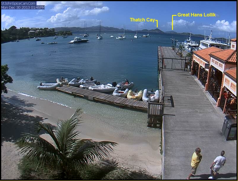 St. John offers amazing views of numerous other islands and cays, but the clarity of the atmosphere determines just how far and how clearly you can see. On a very clear day from Gifft Hill, we can make out the slopes of El Yunque in Puerto Rico, which is 65 miles away. Its summit is nearly always in the clouds. Vieques and Culebra are usually visible at 45 miles distance, but it takes clear air to really make them pop. Visibility is typically clearest in the winter; from April through October, Sahara dust comes and goes, making clear days less frequent. Water vapor in the air is another factor. When we aren't on island, a simple visual comparison in the Spice Cam image provides a good sense of how clear the air is: simply compare the relative contrast of Thatch Cay against the adjacent (but farther away) Great Hans Lollik. Thatch Cay is just over 4 miles from the ferry dock, whereas Great Hans Lollik is over twice as far away, at 8.5 miles. Normally, both will be visible, with GHL being a bit lighter and lower in contrast. If the two islands are comparably contrasty and dark, the visibility is excellent; photo-ops await! If GHL is barely visible, or missing altogether, heavy Sahara dust or a passing rainstorm are the likely culprits. The two islands are labeled in the attached Spice Cam image, taken today, on a day of average visibility.